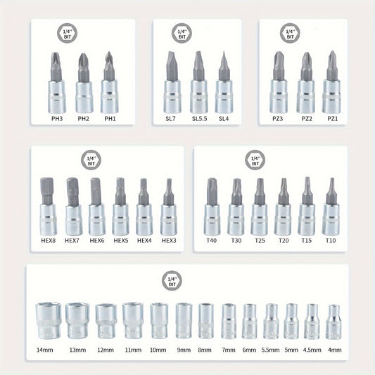 46pcs Car Repair Tool Kit, 1/4 Inch Ratchet Wrench Set with Versatile Bit Socket Set And Extension Bar, Combo Tools Kit, for Car, Motorcycle & Bicycle Repair