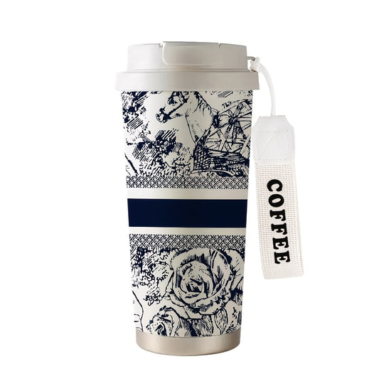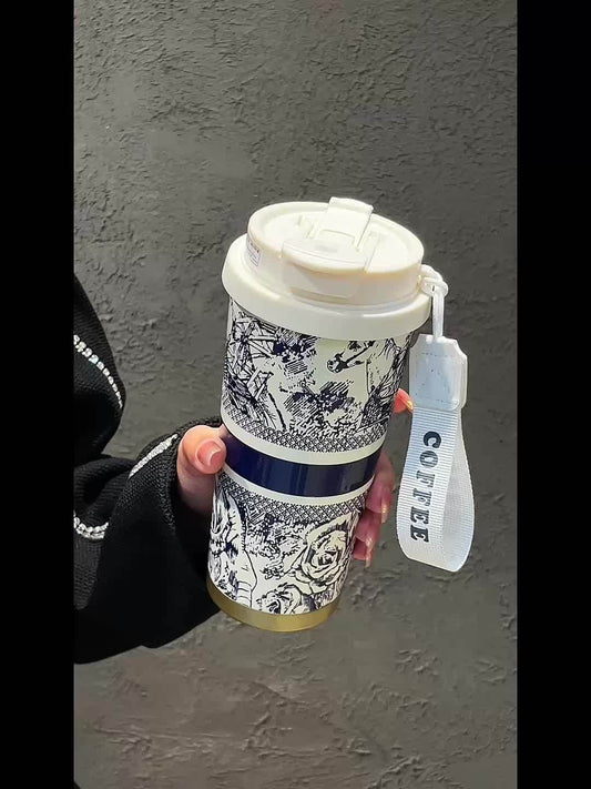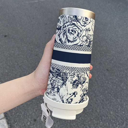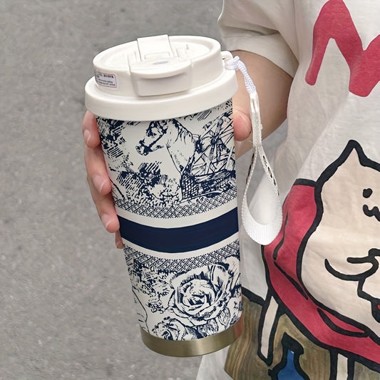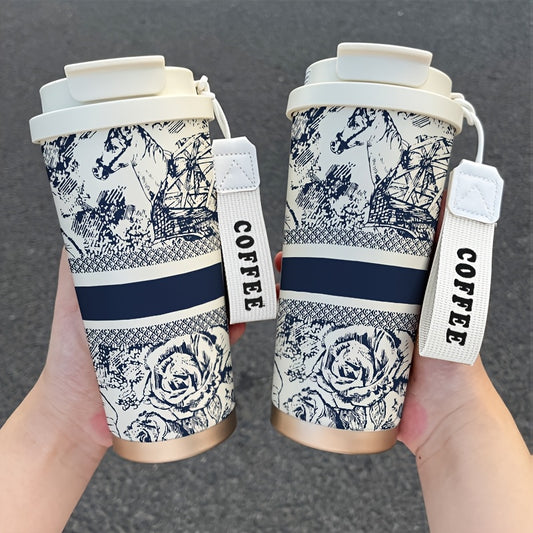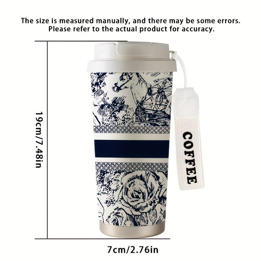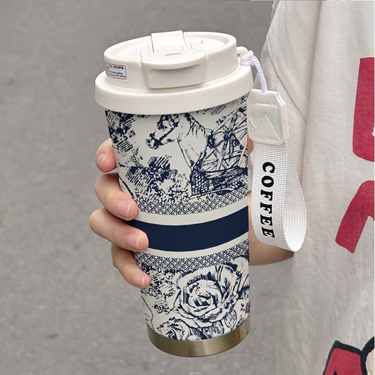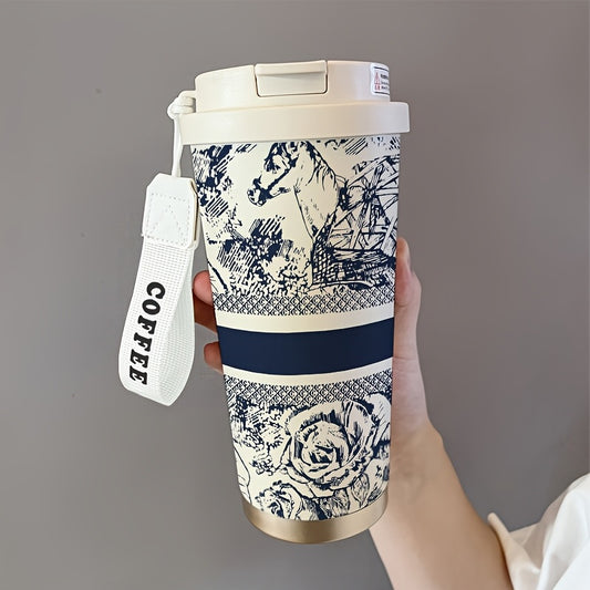 530ml Large Insulated Thermos Cup with Elegant Floral Vintage Design - Double-Wall Vacuum Insulation & Leakproof Lid, Portable Coffee & Cold Drink Thermos with Carry Strap & Straw for Office, Travel, Camping, Outdoor - Beige
