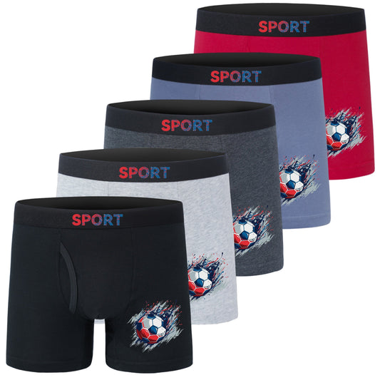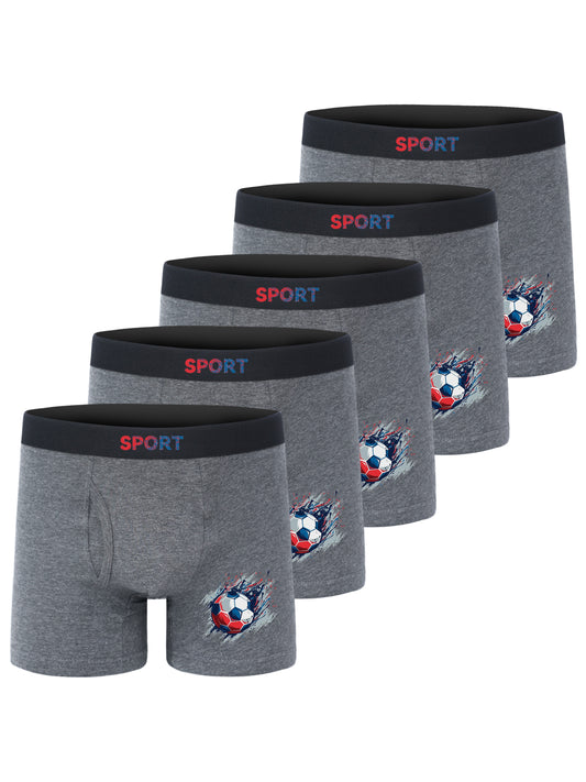 5pcs Football Print Boxer Briefs for Teen Boys - Breathable, Stretchy, Comfort Fit with Elastic Waistband & Half-Button Closure, Black with White & Red Soccer Design, Sports Underwear, Youth Athletic Wear, Sporty Boxers, Brea