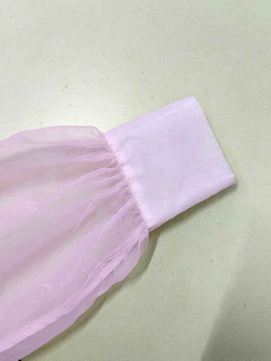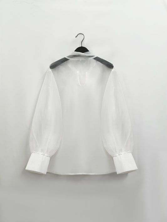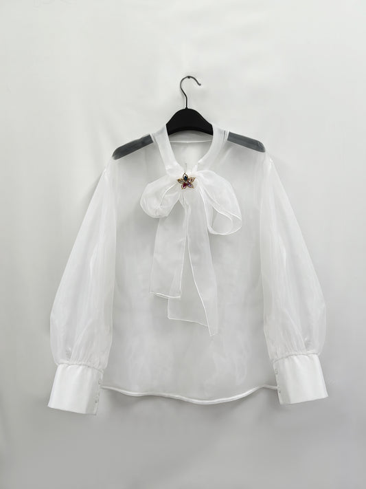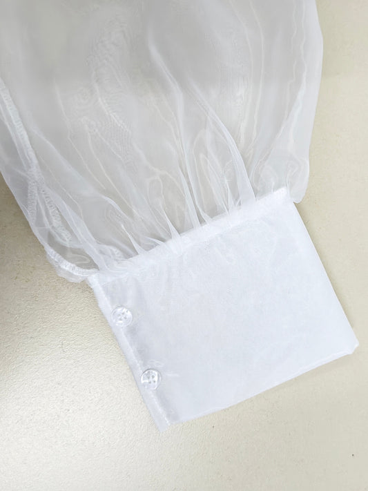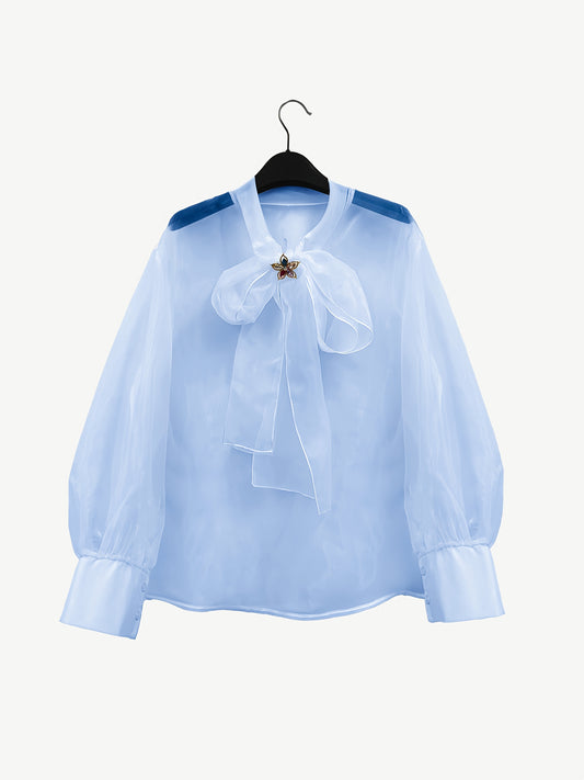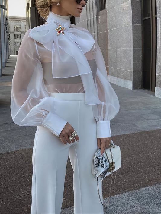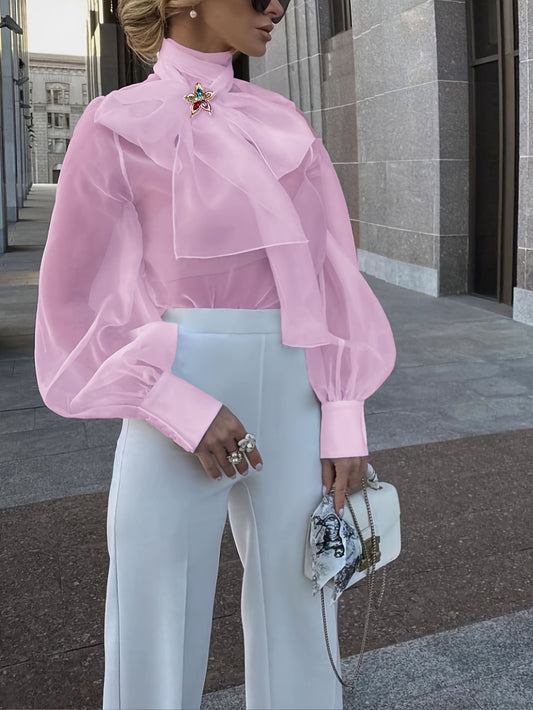 Elegant Plus Size Women'S Blouse with Sexy Bow Collar, Bubble Sleeves, and Pearl Accents - Chic Solid Color Non-Stretch Fabric for All Seasons, Plus Size Blouses