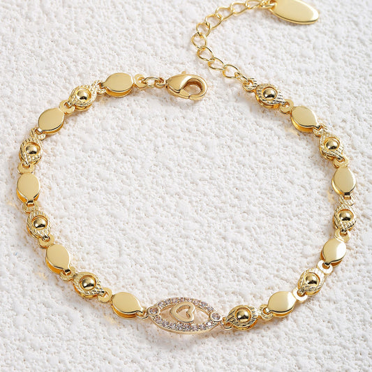 Elegant 18K Gold Plated Copper Bracelet with Synthetic Cubic Zirconia, Heart and Leaf Motif Openwork Design for everyday wear and special occasions.