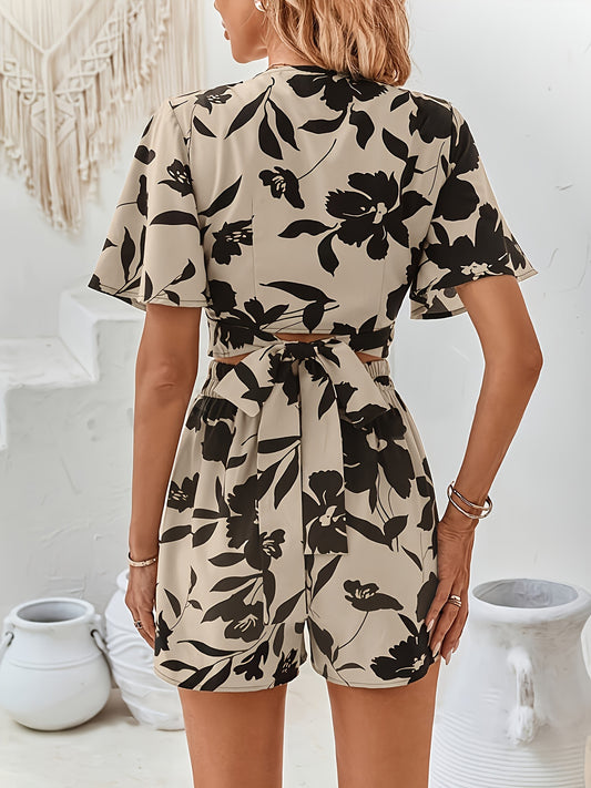 Elegant Floral Print Crop Two-piece, Short Sleeve V Neck Blouse & Elastic Waist Shorts Outfits, Women's Clothing