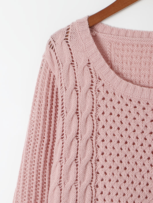 Elegant Pink Knit Sweater Dress for Women - Casual Long Sleeve, Round Neck, Bodycon Midi with Cable Knit Pattern, Perfect for Fall/Winter, 100% Polyester