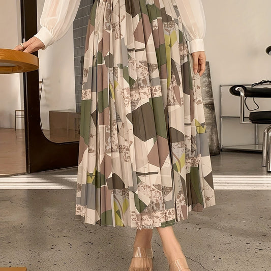 Elegant Geometric Pattern Pleated Midi Skirt for Women - Versatile, Fashion-Forward, Non-Stretch Polyester Fabric, Machine Washable - Perfect for All Seasons, Allseason Wear|Asymmetrical Hemline|Comfortable Fit