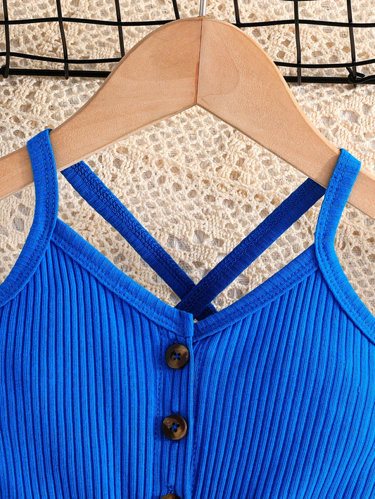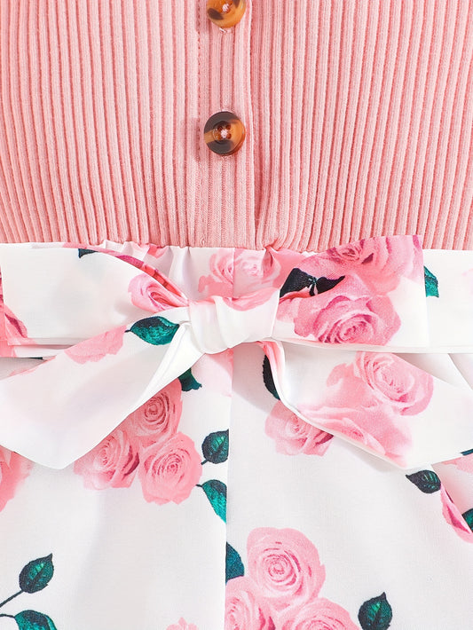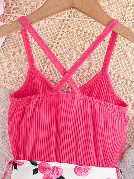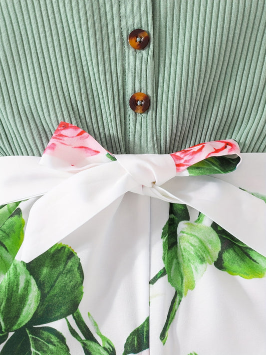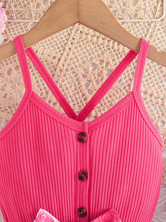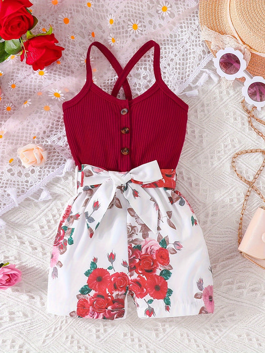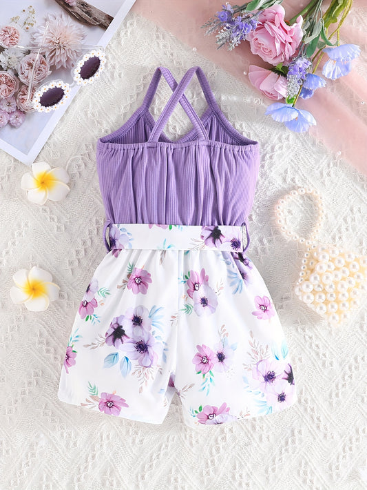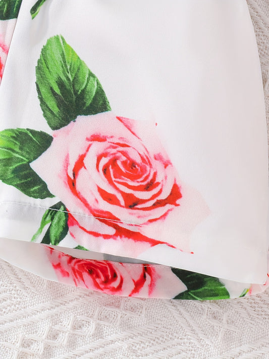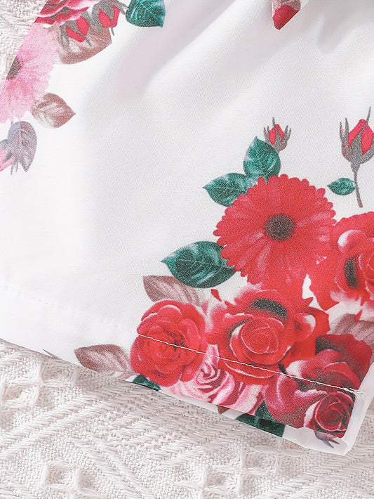 Girls' Summer Casual Floral Print Off-Shoulder Jumpsuit with Adjustable Waist Belt - Lightweight Breathable Shorts for Outdoor Play & Daily Wear, Blue & White Flower Design, Perfect for Weekend Outings, Cute Outfits for Girls