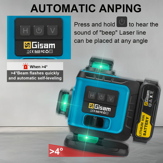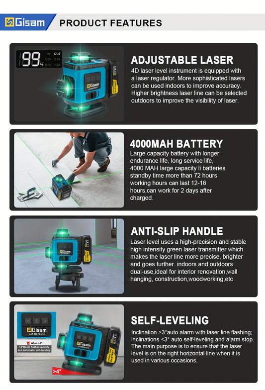 Gisam Multifunctional 16 Lines 4D Green Laser Level with Tripod & App Control, 360° Self-Leveling Horizontal & Vertical Cross Lines, USB & Battery Powered, Includes Carrying Case, Super-Powerful Beam, Portable Design for Ind