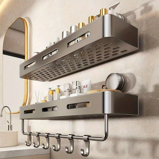 1pc Heavy-Duty Rustproof Shower Organizer - Bathroom Shelf with Towel Hooks, Space-Saving Bathroom Storage, No-Drill Installation, for Bathroom, Shower, or Kitchen - Modern Bathroom Decor, Shower Shelves, Contemporary Design,