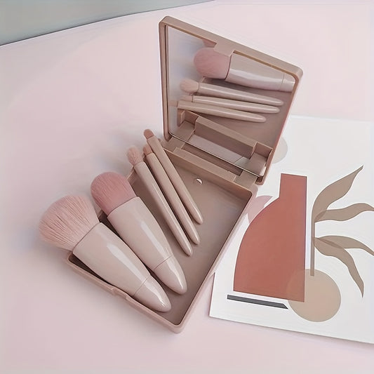 5pcs Makeup Brush Set with Mirror - Nylon Bristles, Fragrance-Free for All Skin Types, Includes Oval Foundation & Blending Brushes