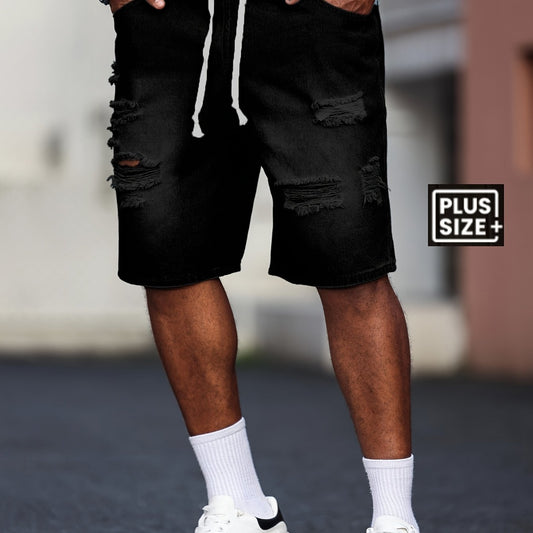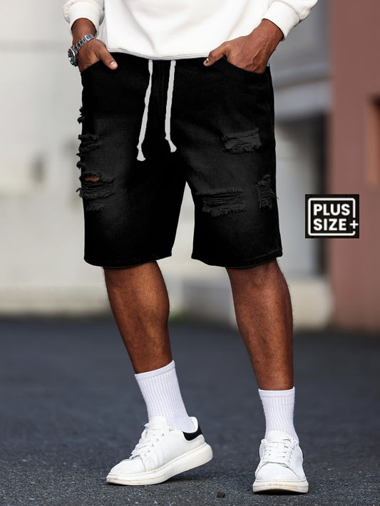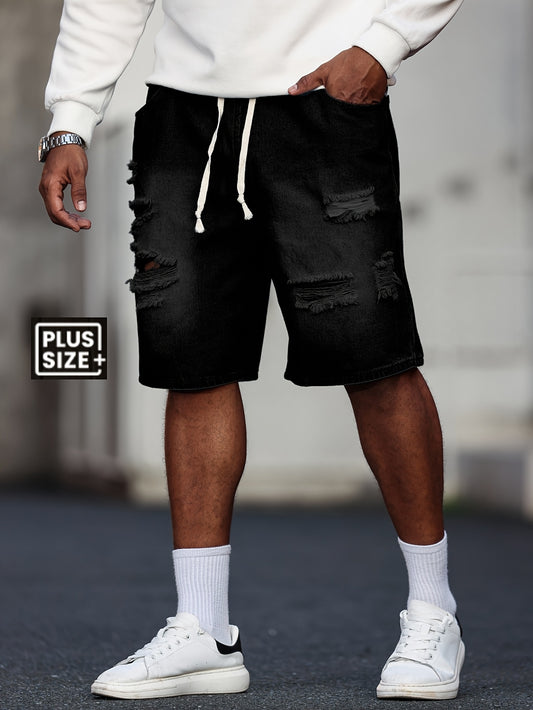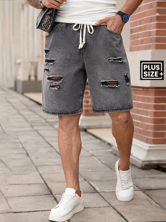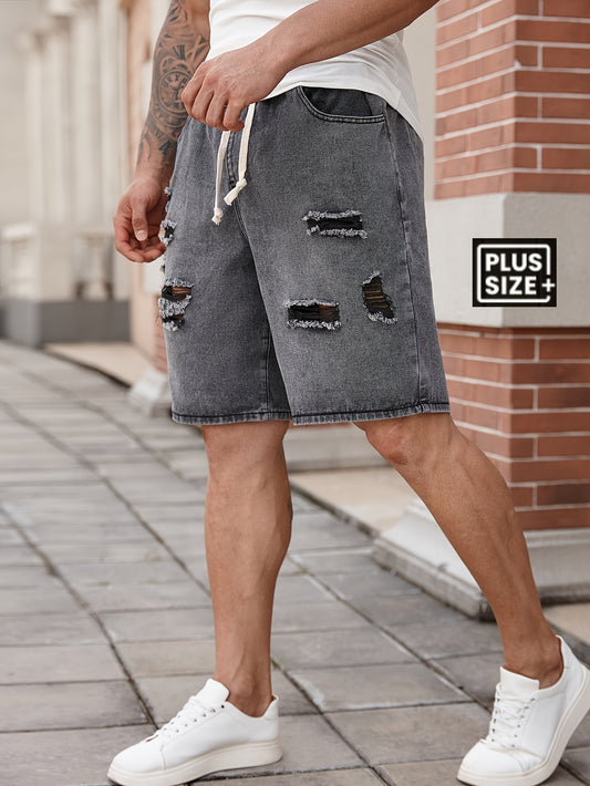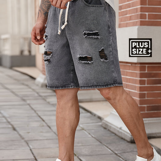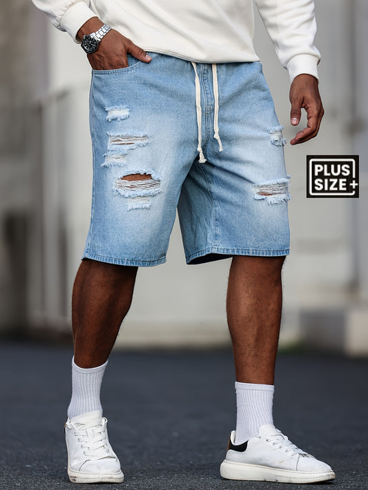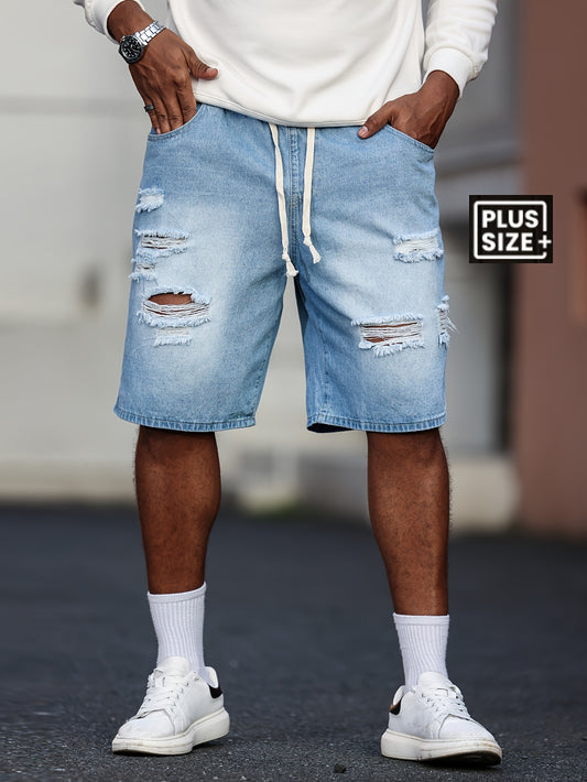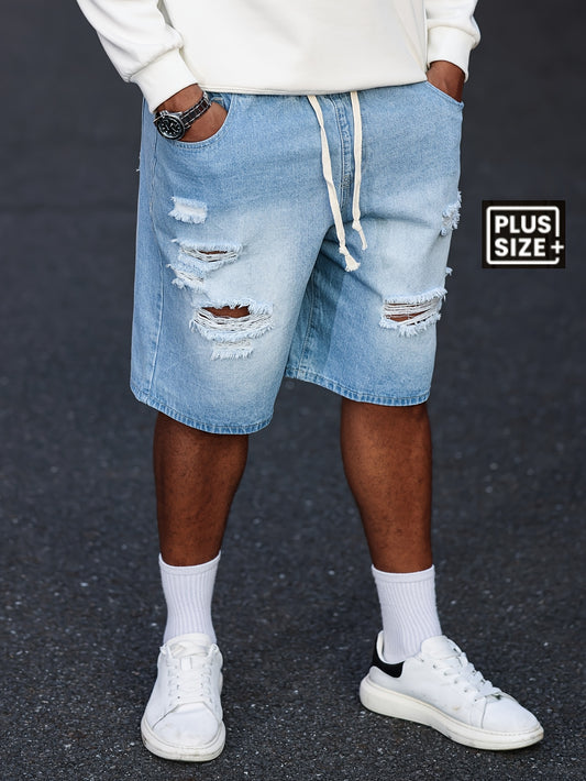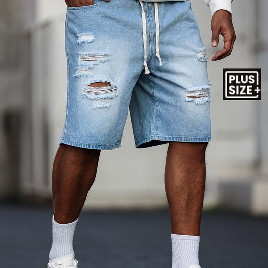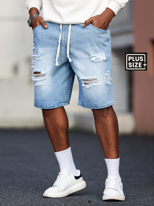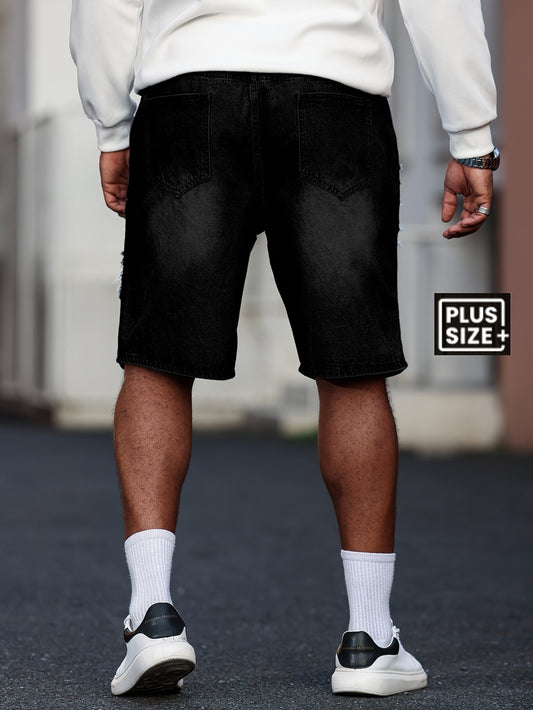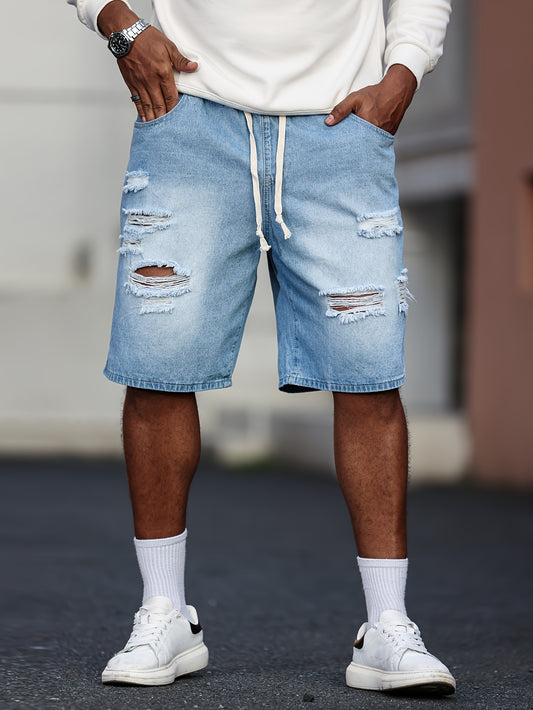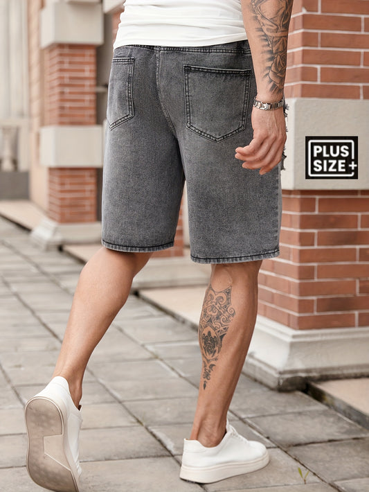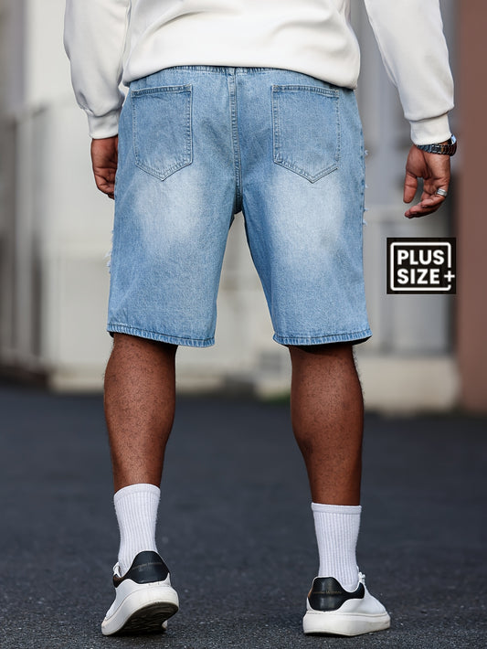 Men's Plus Size Denim Shorts - Extended and elongated design, distressed denim shorts | Lightweight casual pants with pockets, perfect for summer outfits, parties, and leisure occasions - Classic vintage washed look, stylish
