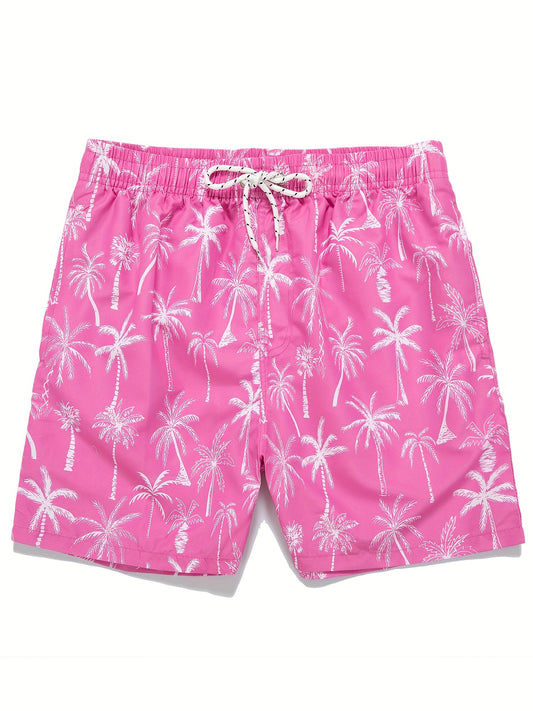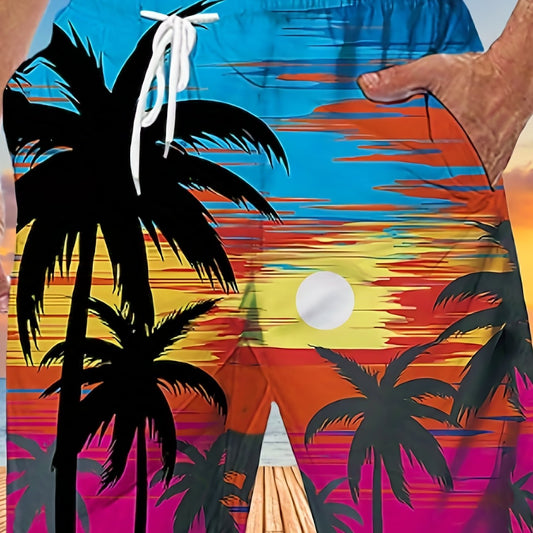 Men's Quick Dry Hawaiian Board Shorts With Pockets, Casual Coconut Tree Graphic Drawstring Swim Trunks For Summer Vacation Beach Pool Outdoor
