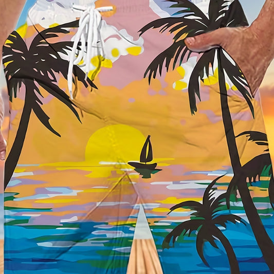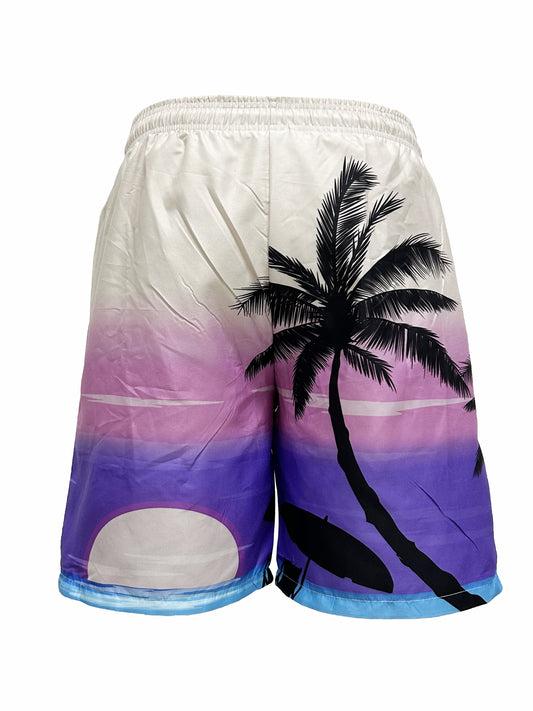 Quick Drying Comfortable Breathable Gradient Palm Tree At Dawn Seaside Drawstring Swim Trunks, Men's Board Shorts Swimwear For Summer Vacation Resort Beach Pool