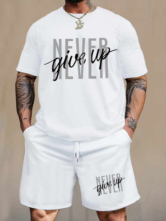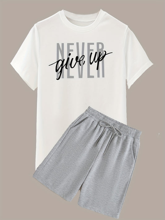 Men's Fashion NEVER GIVE UP Letter Print Loungewear Set, Short Sleeve Crew Neck Graphic T-shirt & Drawstring Shorts With Pockets, Casual Pajama Set, Men's 2piece Outfits