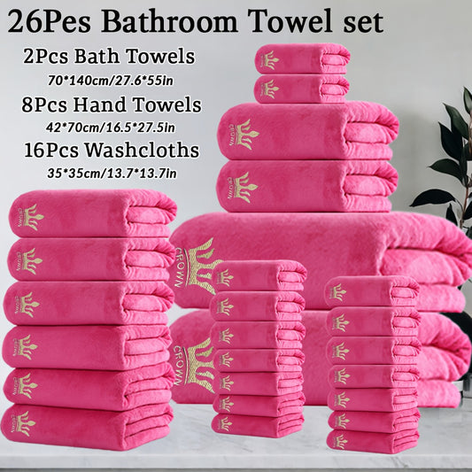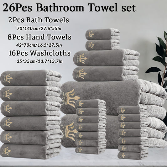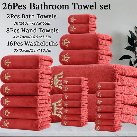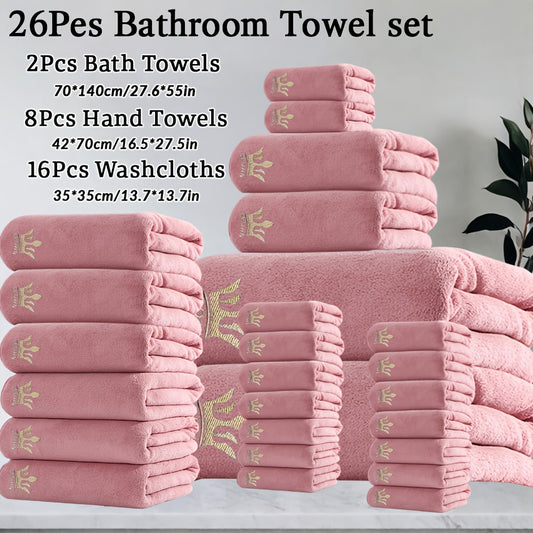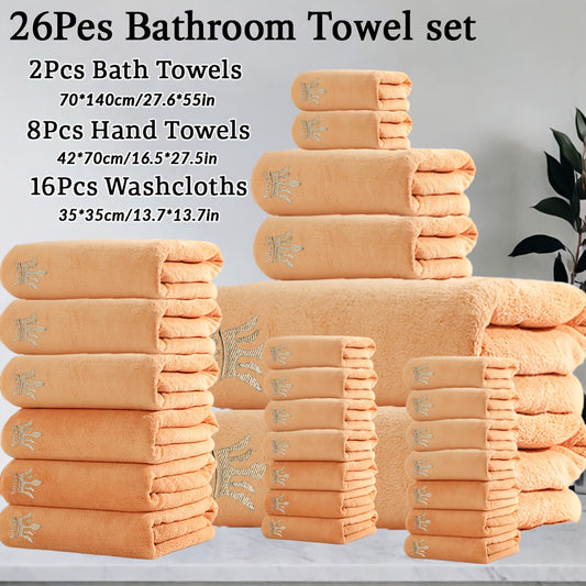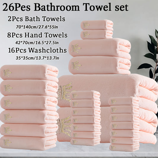 26pcs Bathroom Solid Embroidered Towel Set, Including 16 Square Towels + 8 Hand Towels + 2 Bath Towels, Made of Coral Fleece, Available in Multiple Colors, Soft And Comfortable, Good Water Absorption, Suitable for Fitness, Ba
