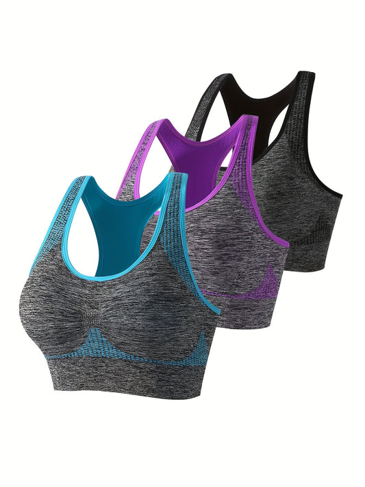 3pcs Contrast Binding Quick Drying Sports Bra, Racerback Shockproof Running Fitness Crop Tank Top, Women's Activewear