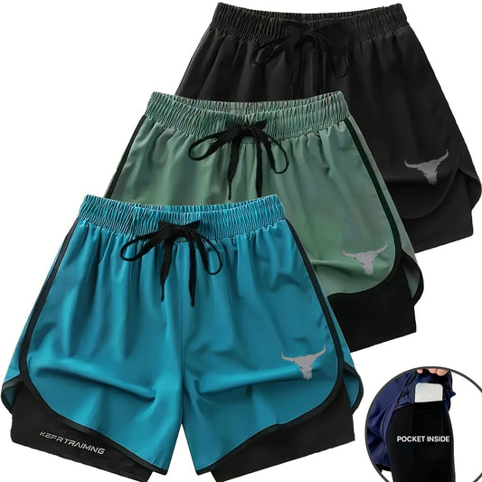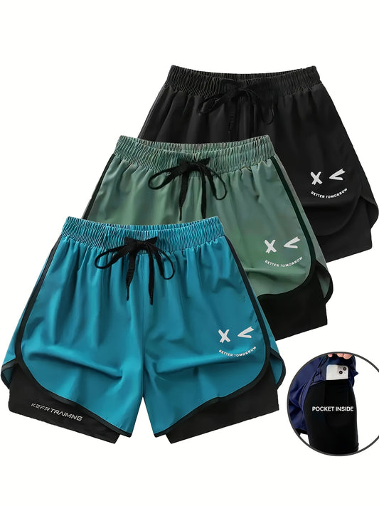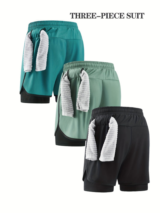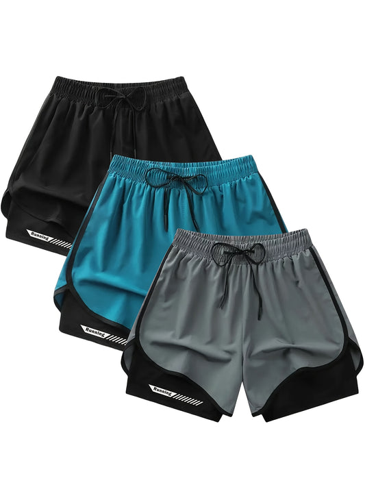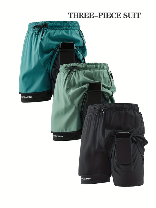 3pcs Men'S Sports & Casual Running Shorts - Stretchy, Breathable, Quick-Dry, Anti-Glare with Pockets, Solid Colors (Black, Green, Teal), Drawstring Waist, Polyester Fabric, Perfect for Fitness & Outdoor Activities, Workout Sh