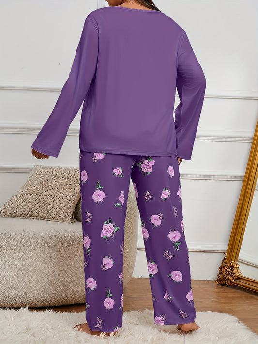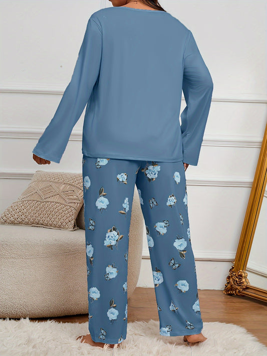 Adult Butterfly Print Pajama Set - Casual Spring/Fall Polyester Knit Fabric, Elasticity, Long Sleeve Pants, Home Pajama Set for Adults