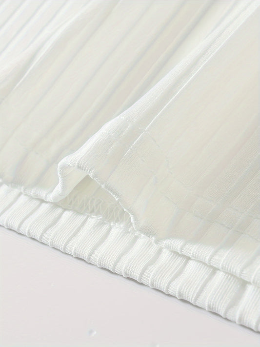 Contrast Trim Pleated Elegant Blouse, Crew Neck Short Sleeve Back Keyhole Blouse For Spring & Summer, Women's Clothing