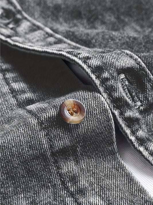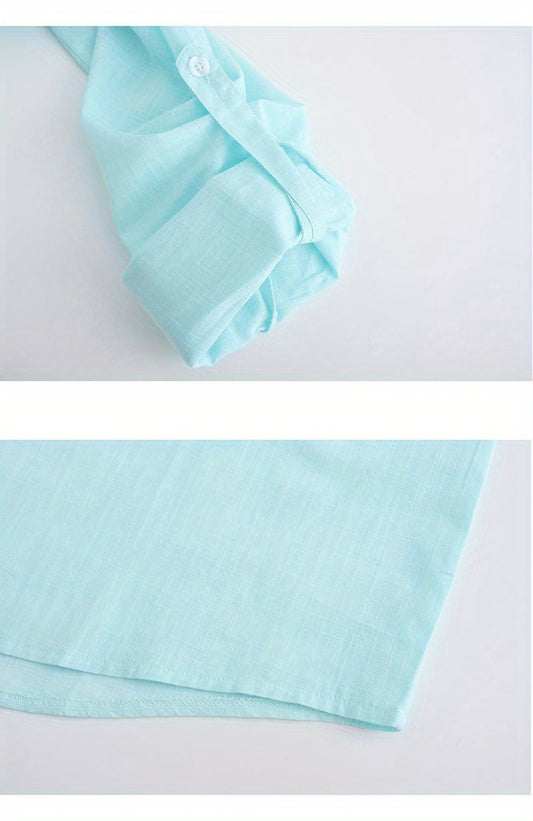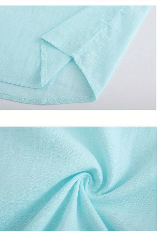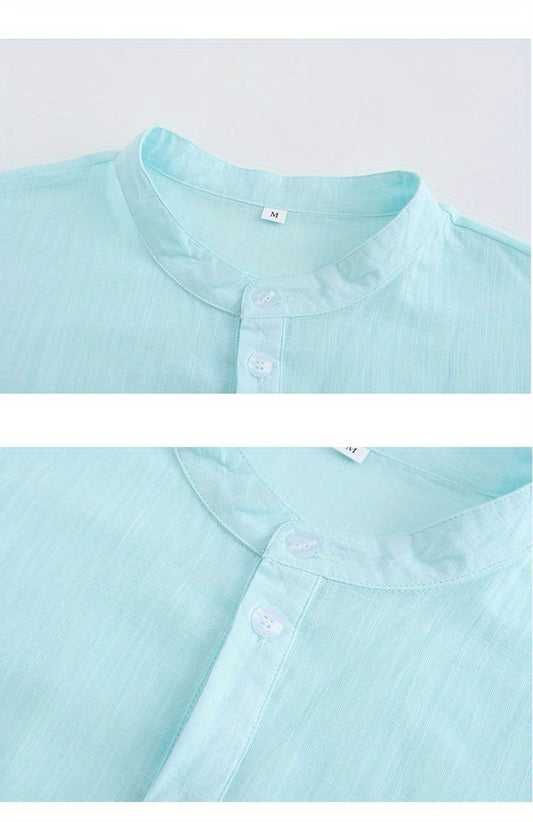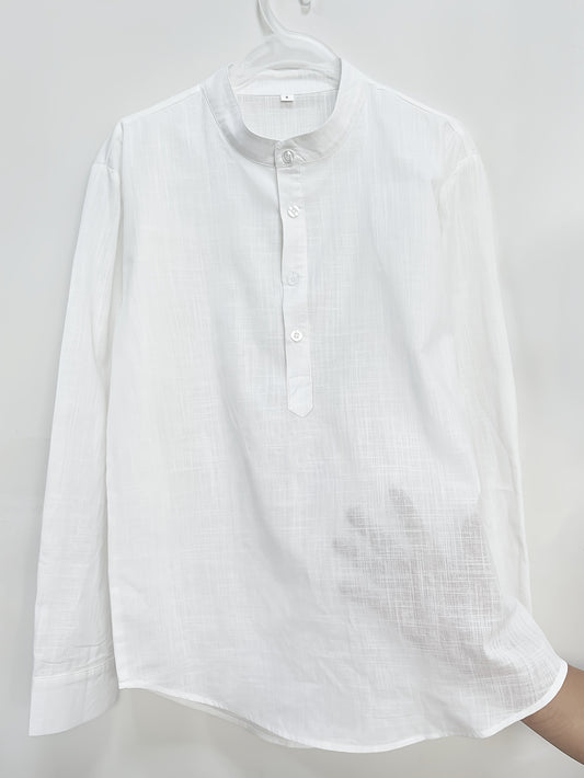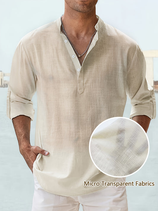 Men'S Casual Long-Sleeve Shirt, Lightweight And Semi-Transparent, Suitable for Spring, Autumn, And Summer. Made of Solid Color Cotton, Featuring a Half-Open Design, Vintage Style, Breathable, Cool, And Sun-Protective.