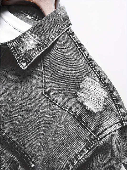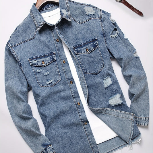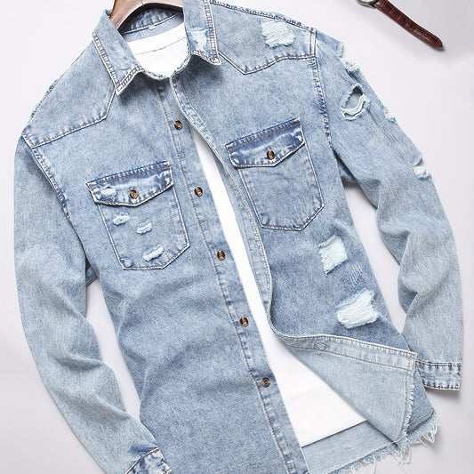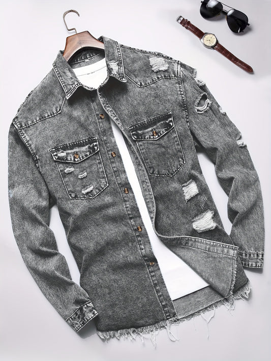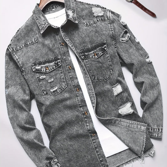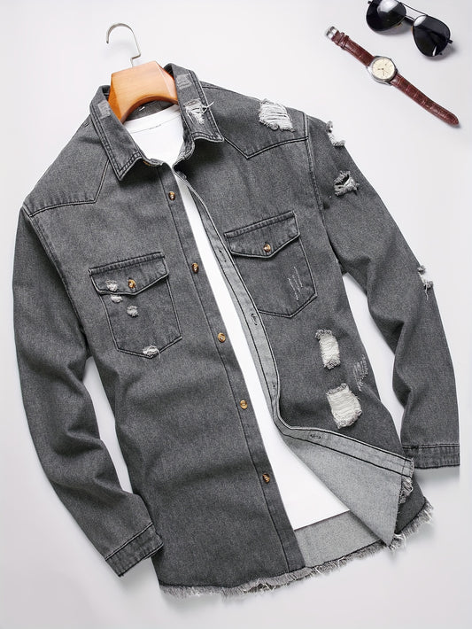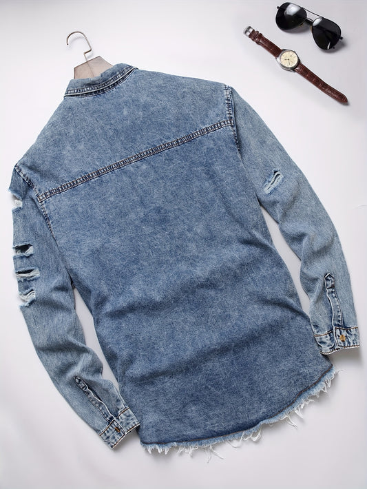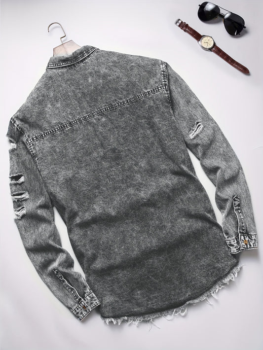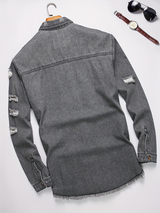 Men's Trendy Ripped Design Casual Button Up Long Sleeve Denim Shirt, Men's Clothes For Spring Summer Autumn, Tops For Men