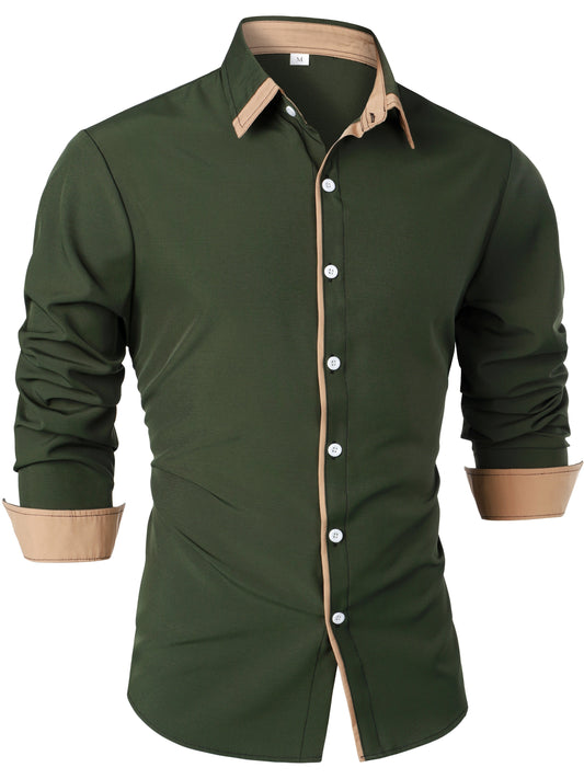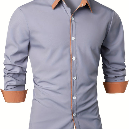 Mature Style Men's Casual Trim Contrast Button Long Sleeve Shirt, Spring Fall