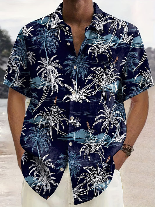 Men'S Casual Hawaiian Shirt with Coconut Tree Print, 100% Polyester, Short Sleeve, Button Front, Lapel Collar, Regular Fit, Woven Fabric, 110gsm - Spring/Summer Beachwear, Plus Size