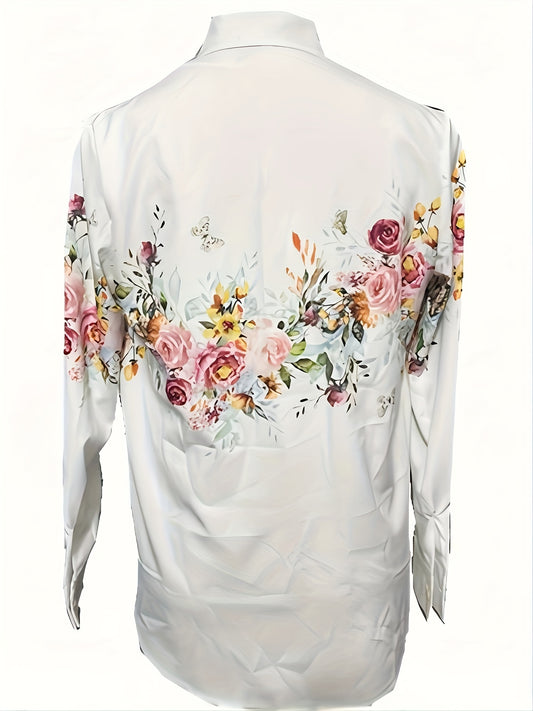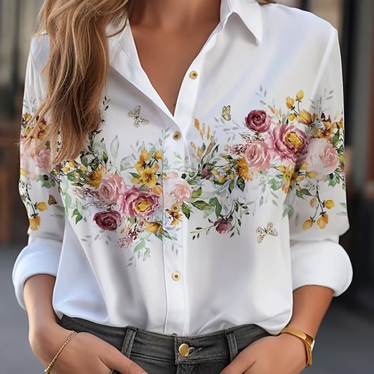 Floral Print Button Front Shirt, Casual Long Sleeve Shirt For Spring & Fall, Women's Clothing