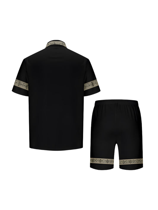 Elegant Men's 2Pcs Outfits, Casual Lapel Button Up Short Sleeve Shirts Hawaiian Shirt And Drawstring Shorts Set For Summer, Men's Clothing