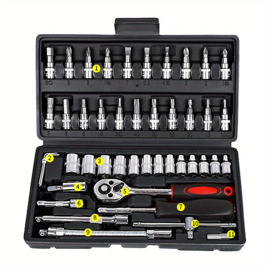 46pcs 2.54/10.16 Cm Drive Socket Ratchet Wrench Set, With Bit Socket Set, Metric And Extension Bar For Auto Repairing And Household, With Storage Case