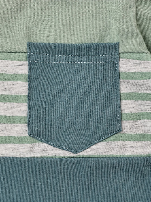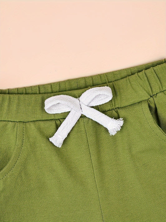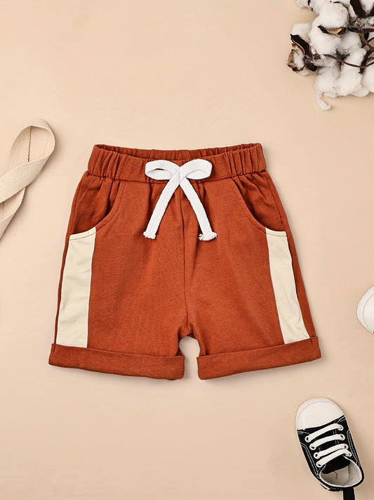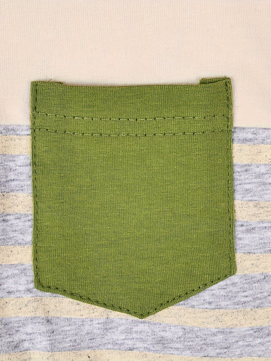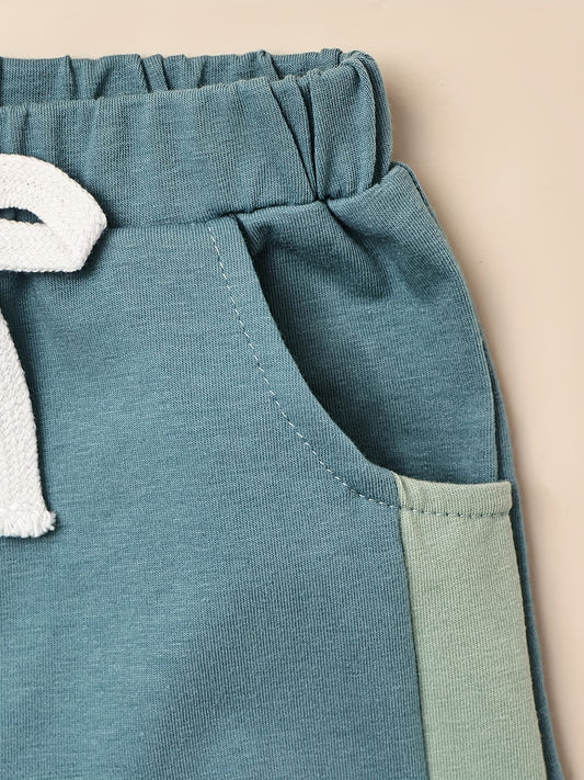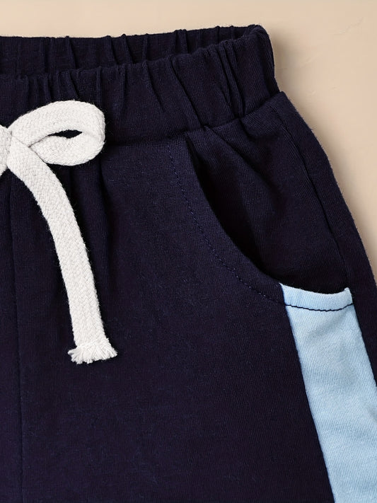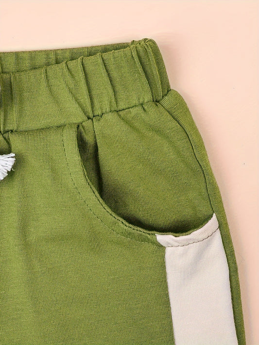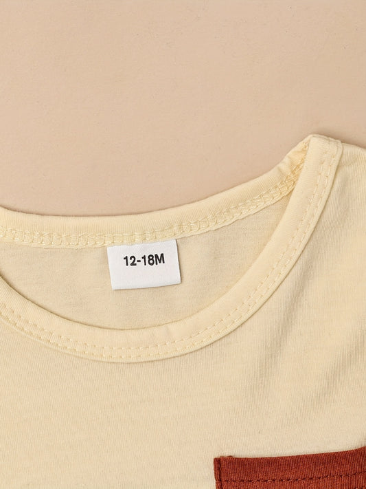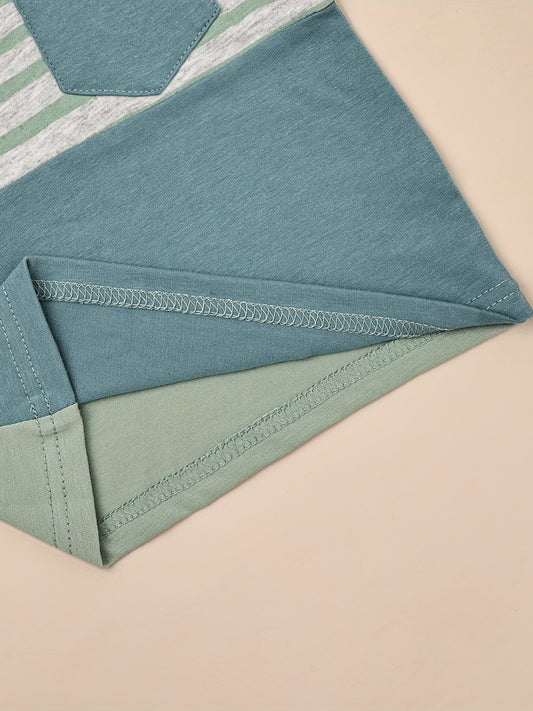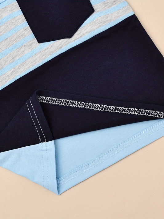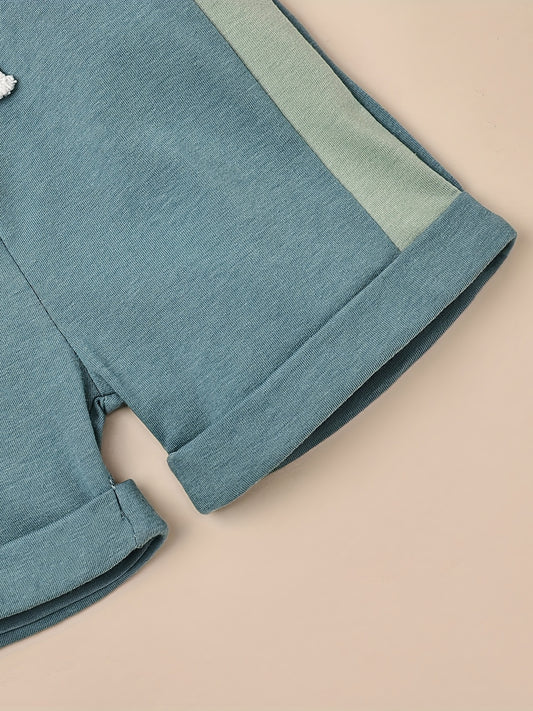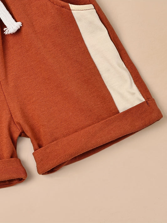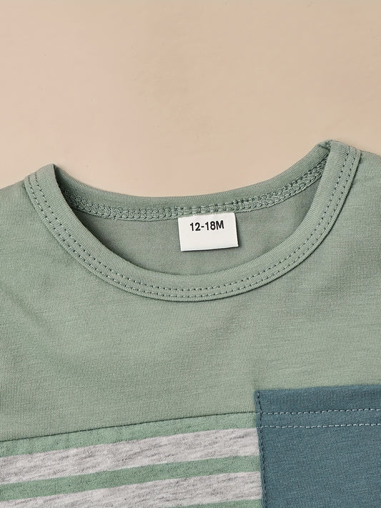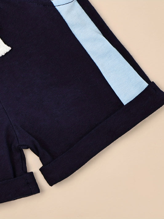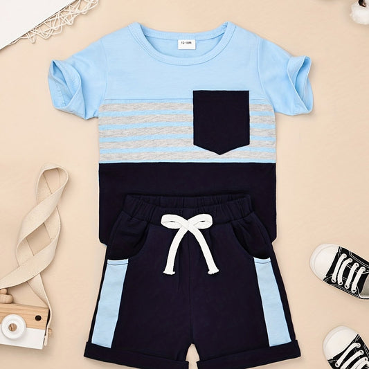 2pcs Baby Boys Summer Outfit Set - Cotton & Polyester Crew Neck T-Shirt with Stripes & Patch Detail, Short Sleeve, Drop Shoulder, Knit Fabric, with Matching Shorts with Belt & Fake Drawstring - Regular Fit, for Outdoor