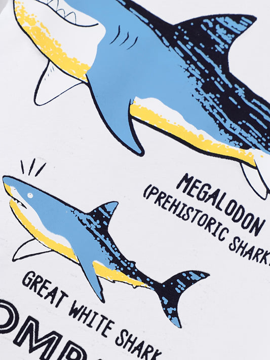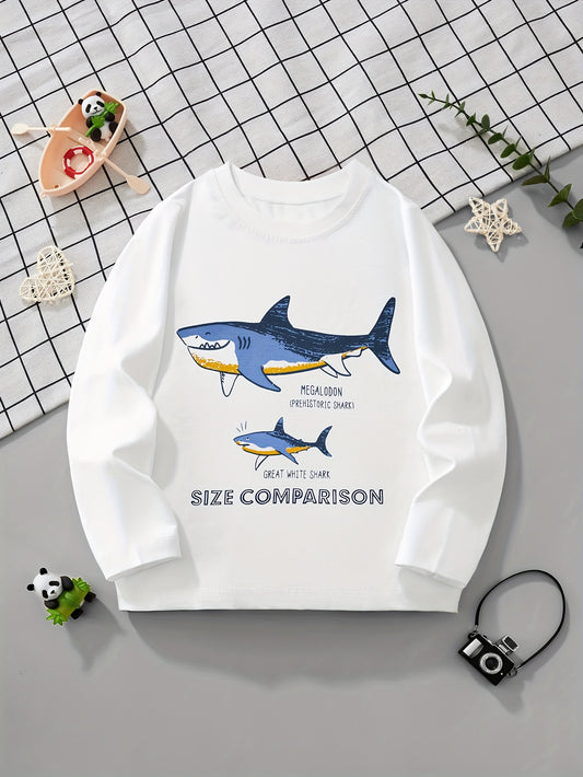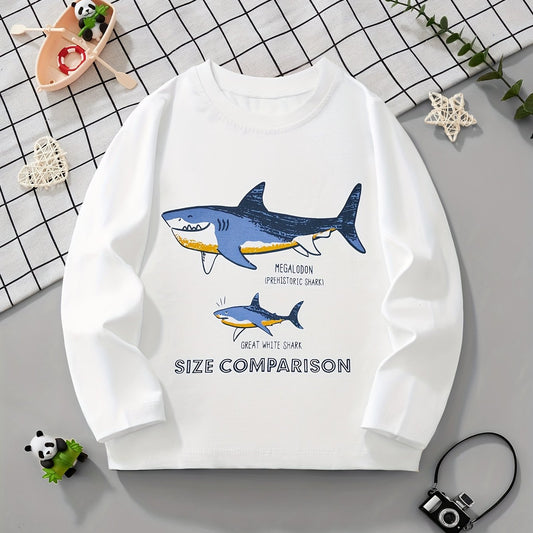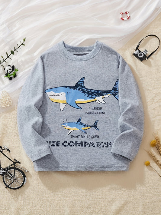 LITTLE BITTY Boys' Cotton Long Sleeve Crew Neck T-Shirt, Cartoon Shark Pattern, Casual Skinny Fit, Breathable Knit Fabric, Regular Sleeve, for Hiking & Outdoor, Weekend Casual Wear - Spring/Summer Collection
