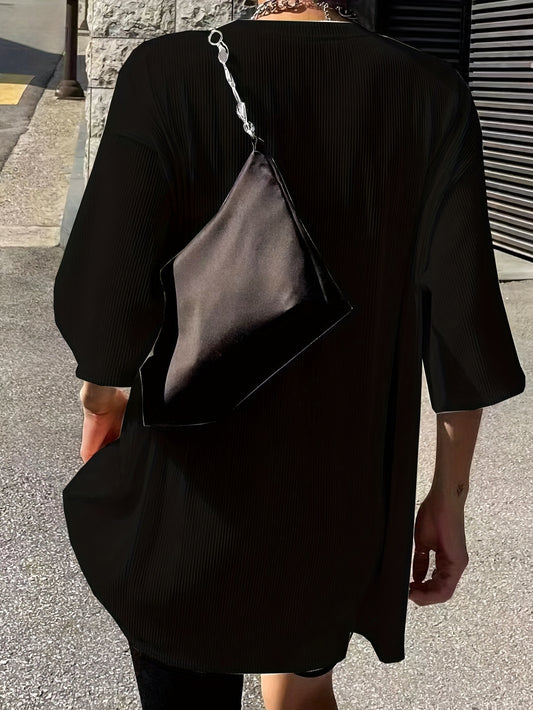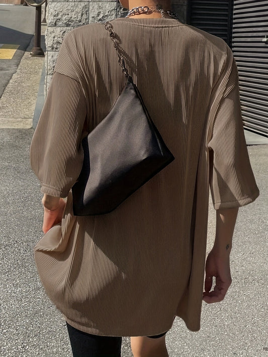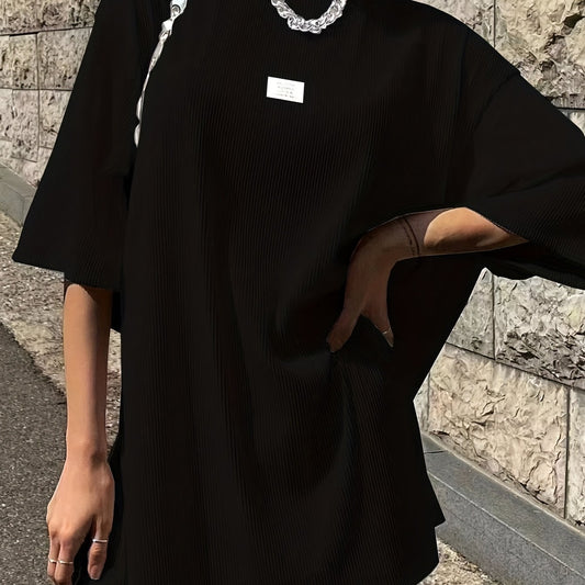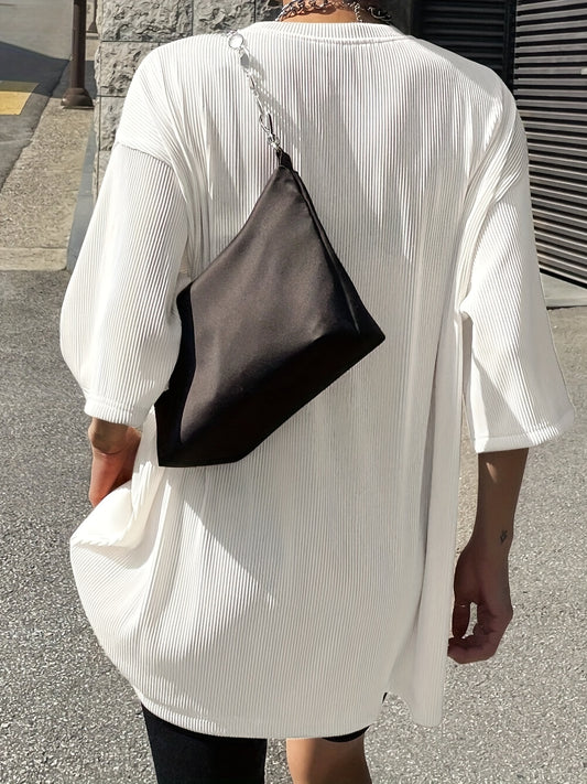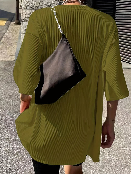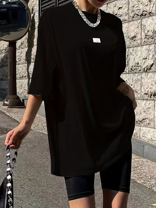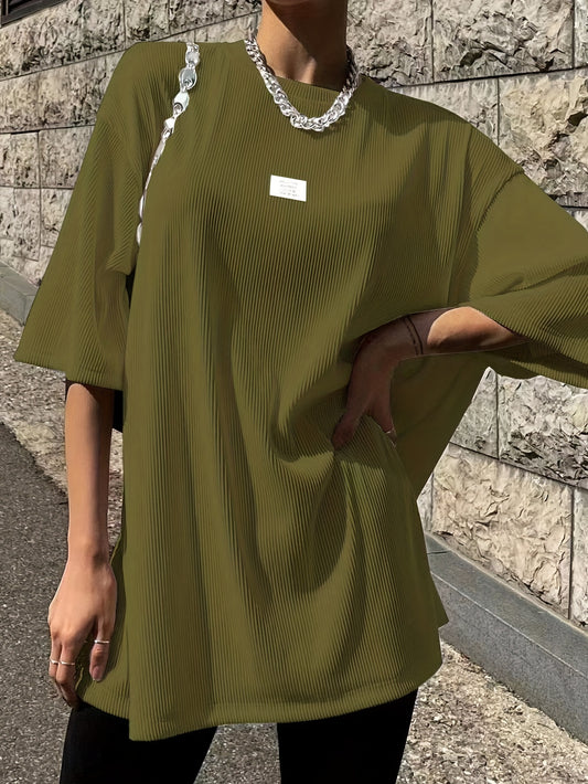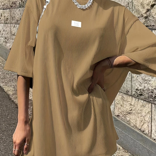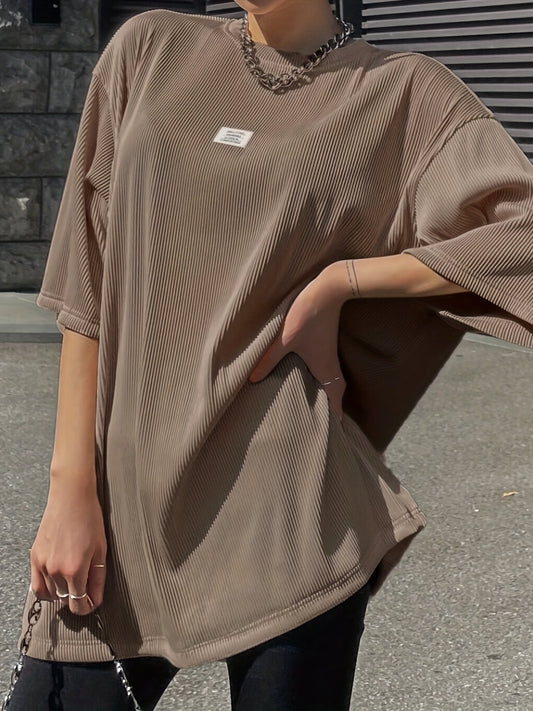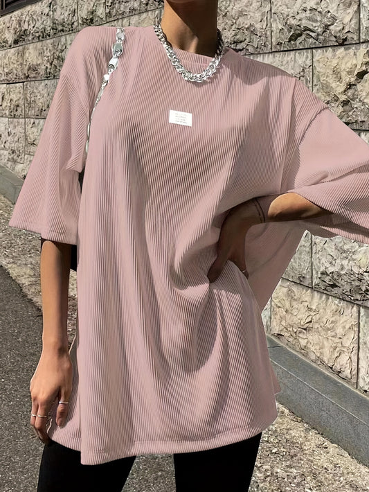 Oversized Drop Shoulder Ribbed T-Shirt, Casual Crew Neck Short Sleeve T-Shirt For Spring & Summer, Women's Clothing