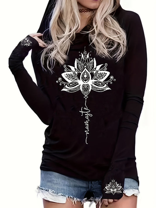 Lotus Print Crew Neck Hooded T-shirt, Casual Long Sleeve T-shirt For Spring & Fall, Women's Clothing