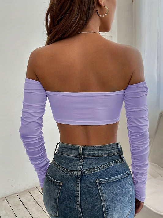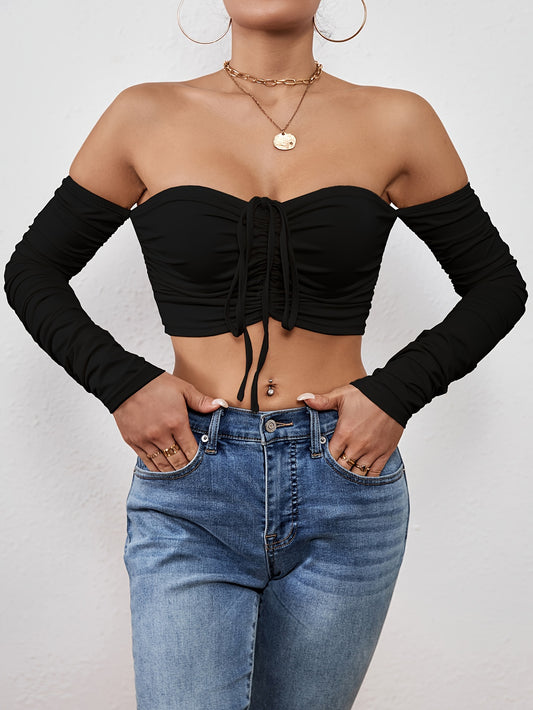 Off Shoulder Ruched T-shirt, Sexy Cropped Drawstring Long Sleeve T-shirt, Women's Clothing