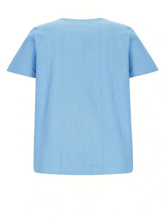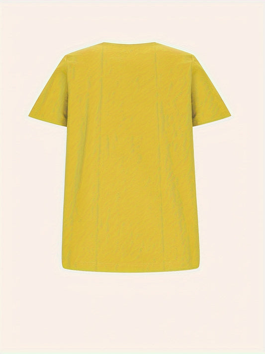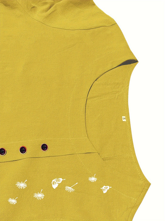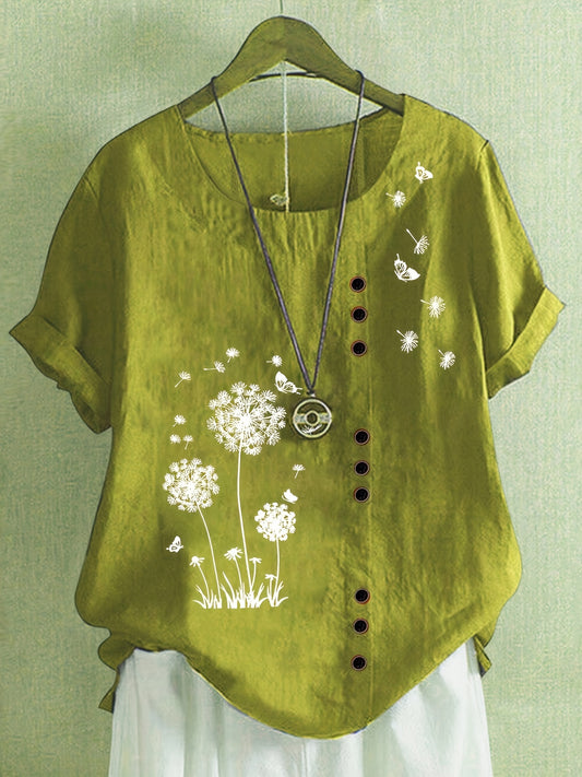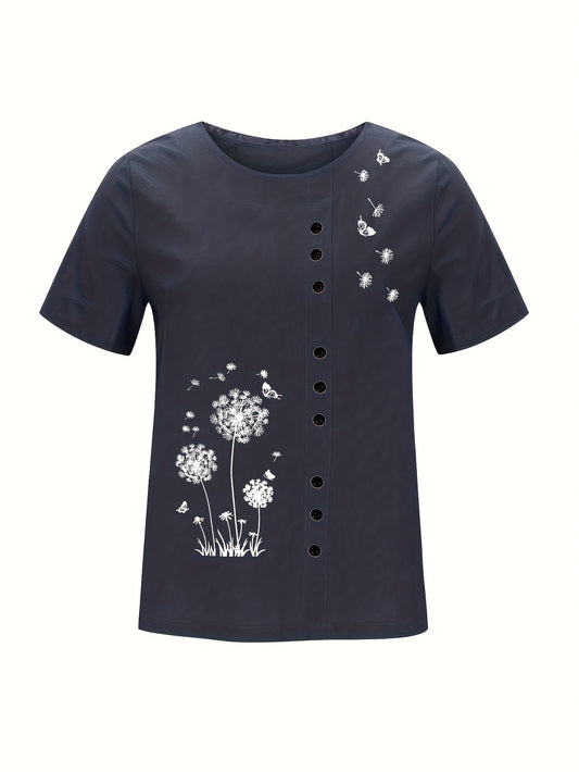 Dandelion Print Button Decor T-Shirt, Casual Crew Neck Short Sleeve T-Shirt For Spring & Summer, Women's Clothing