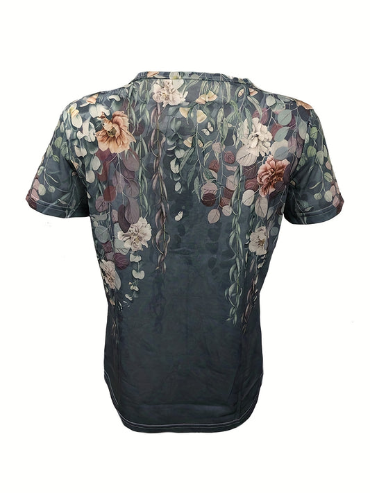 Floral Print Button Front T-Shirt, Casual Short Sleeve T-Shirt For Spring & Summer, Women's Clothing