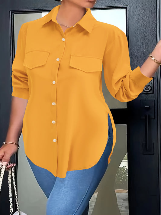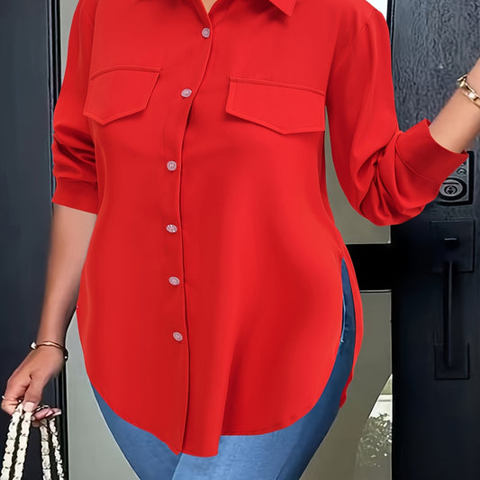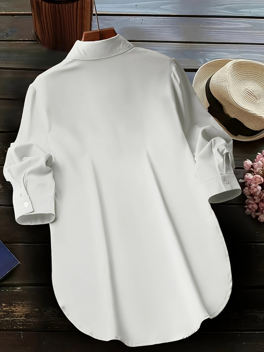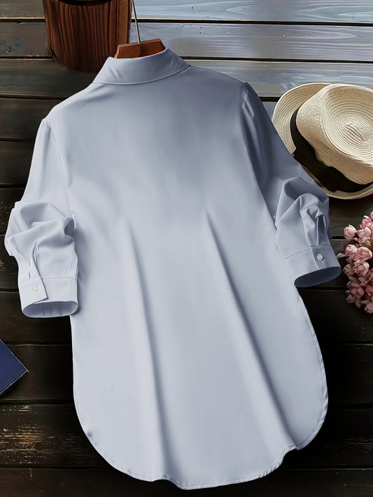 Plus Size Curved Hem Blouse, Casual Button Front Collared Blouse For Spring, Women's Plus Size Clothing