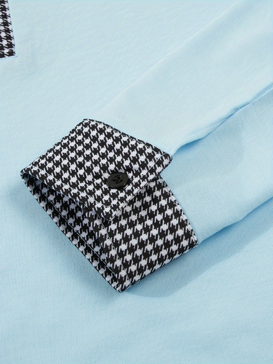 Plaid Print Button Notched Neck Blouse, Casual Rolled Sleeve Blouse For Spring, Women's Clothing