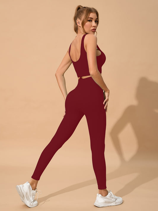 2pcs Solid Color Workout Sets, Backless Sports Bra & Wide Waistband Hip Lift Running Leggings, Women's Activewear