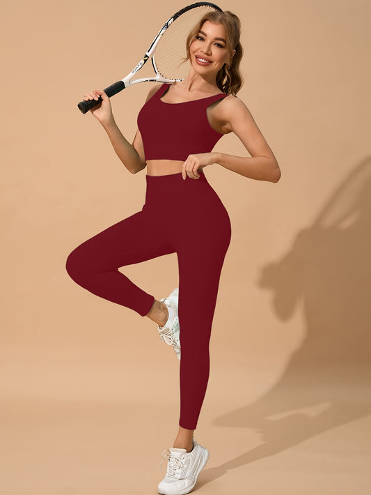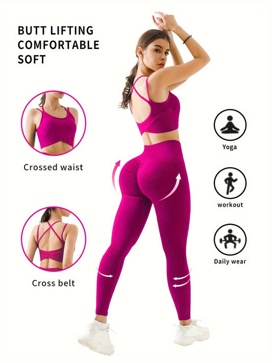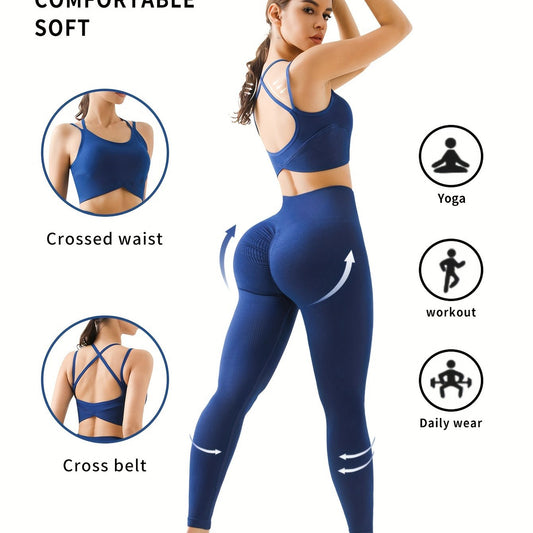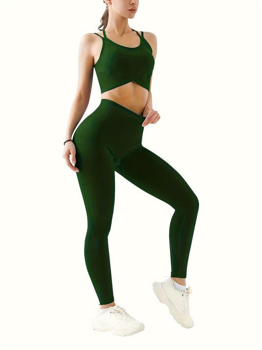 Women's 2-Piece Yoga Set, Cross-Back Sports Bra And High-Waisted Leggings, Seamless Knit Activewear For Gym And Fitness, Solid Color