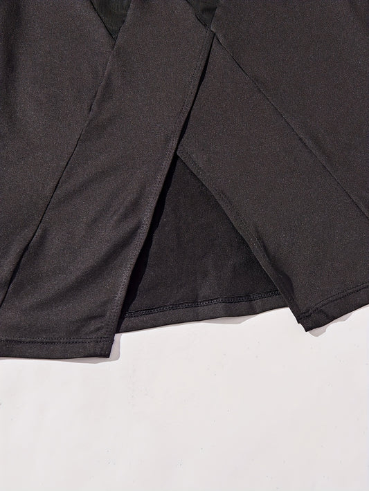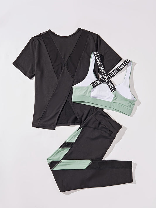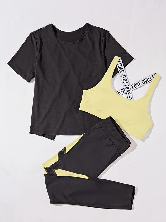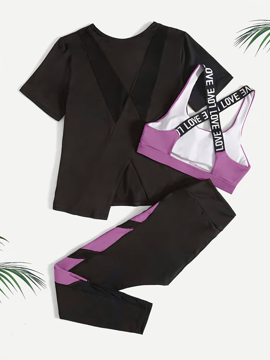 3pcs Women's Yoga Set in Black & Purple - High-Stretch, Sleeveless Sports Bra with Crisscross Straps, Short Sleeve Top & Leggings - Polyester & Elastane Blend, Machine Washable