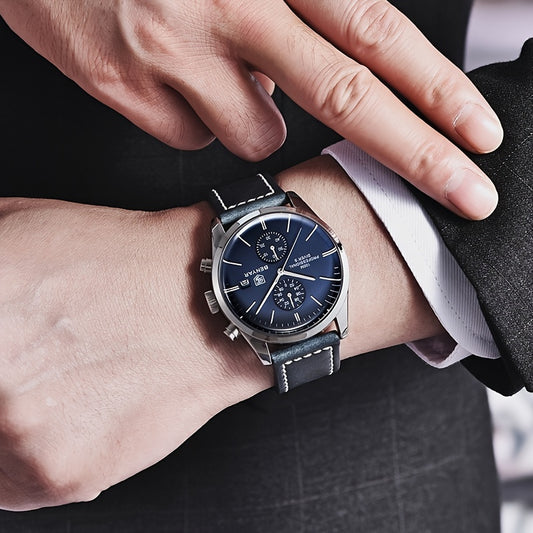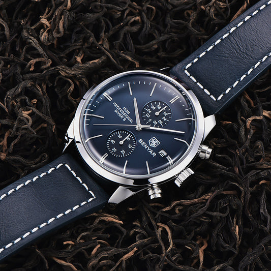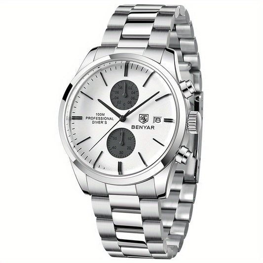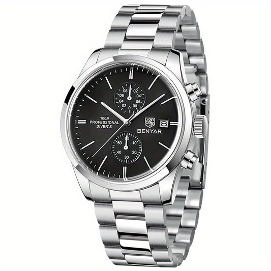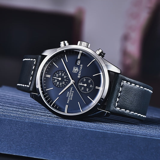 1pc New BENYAR Men's PU Leather Quartz Wristwatch, Men's 100M Multifunctional Watch Military Sports Chronograph Watch For Men