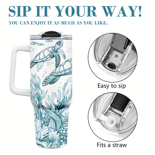 1pc Sea Turtle Tumbler 40oz Tumbler with Handle, Stainless Steel Turtle Water Bottle Travel Mug Coffee Wine Cups Sea Turtle Tumblers for Sea Turtle Lovers Gifts for Women