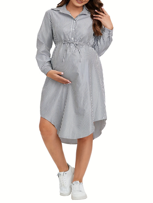 Elegant Striped Maternity Dress with Belt - Long Sleeve, Knee-Length Shirt Style for Women, Machine Washable, Loose, Collar