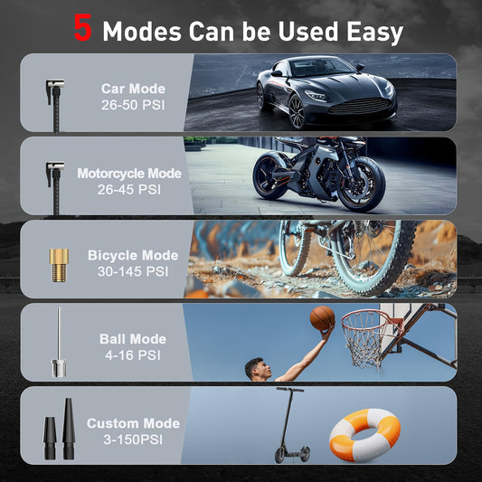 Portable Air Compressor with Digital Pressure Gauge, 150PSI Rechargeable Battery, LED Light, Wireless Tire Pump for Cars, Motorcycles, Bicycles, etc., Black, Motorcycle Tire Inflation, Compact Design, Durable Construction, Us