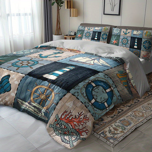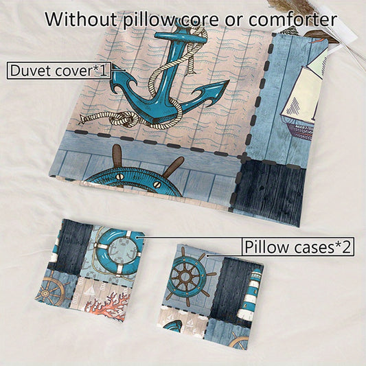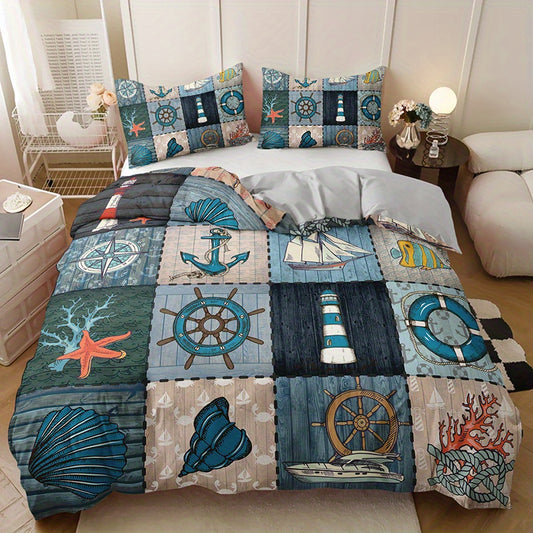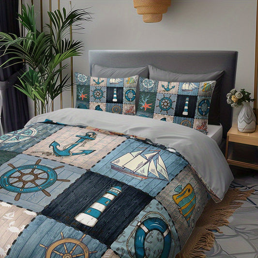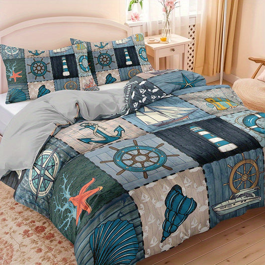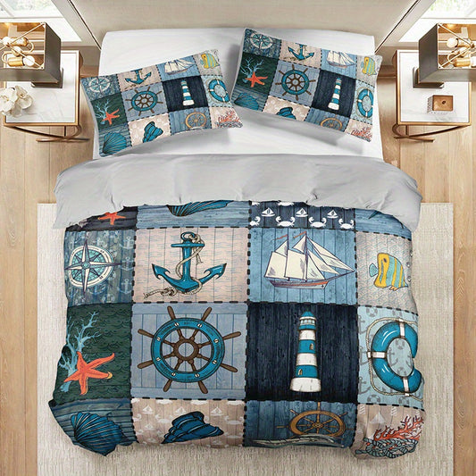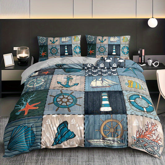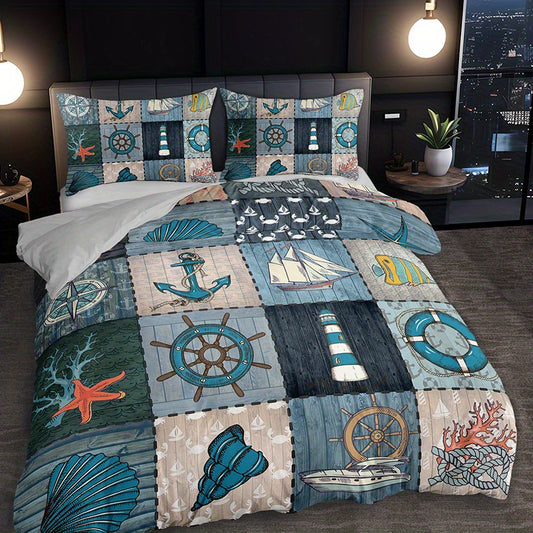 2/3pcs Nautical Vintage Patchwork Duvet Cover Set, 1 Duvet Cover + 1/2 Pillowcases (No Inserts), All-Season Home Dorm Decor with HD Printed Anchor, Seashell, Starfish, Compass, Ship, Lighthouse, and Marine Life in Retro Style