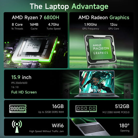 Laptop amd R7-6800H Computer 15.9 Inch 2.5K HD 32GB DDR5 512GB 1TB SSD Ordinateur Portable Gaming Laptop