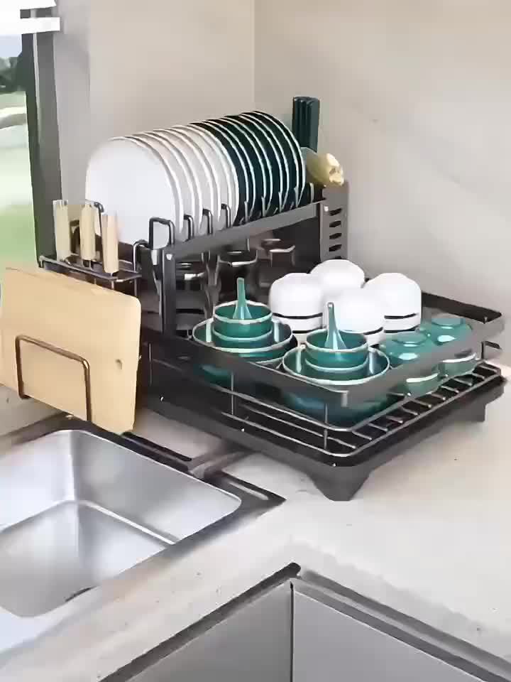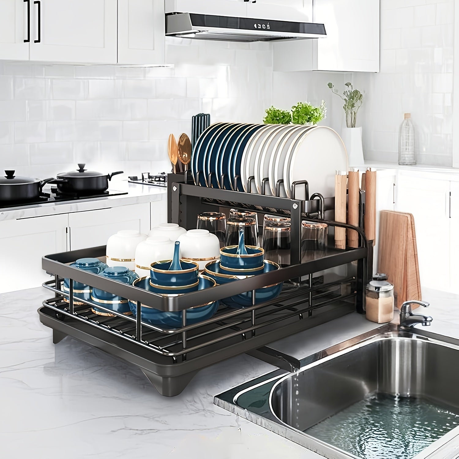 2-Tier Black Iron Kitchen Dish Rack - Large Capacity Organizer with Drainboard, Utensil Holder & Cup Hooks, Foldable Space-Saving Design for Plates, Bowls, Pots, Cutlery - Durable Powder-Coated Finish, Dish Drying Rack for Ki