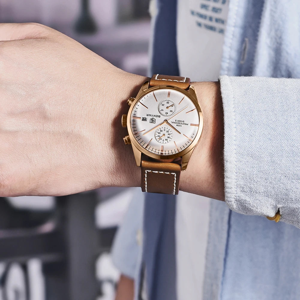 2024 New BENYAR Leather Men Quartz Wristwatches Luxury Brand 100M Waterproof Men Watch Military Sports Chronograph Watch for Men