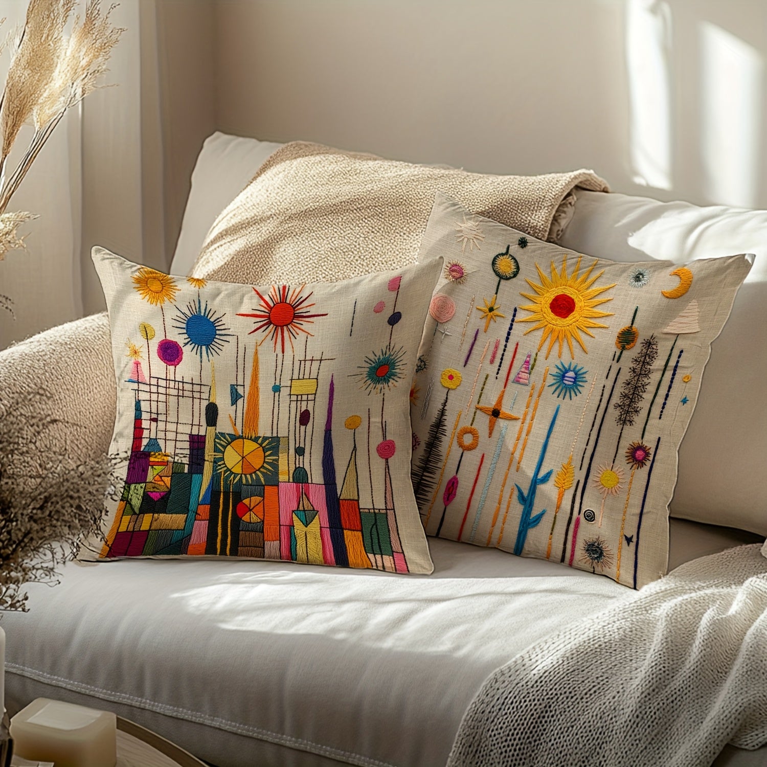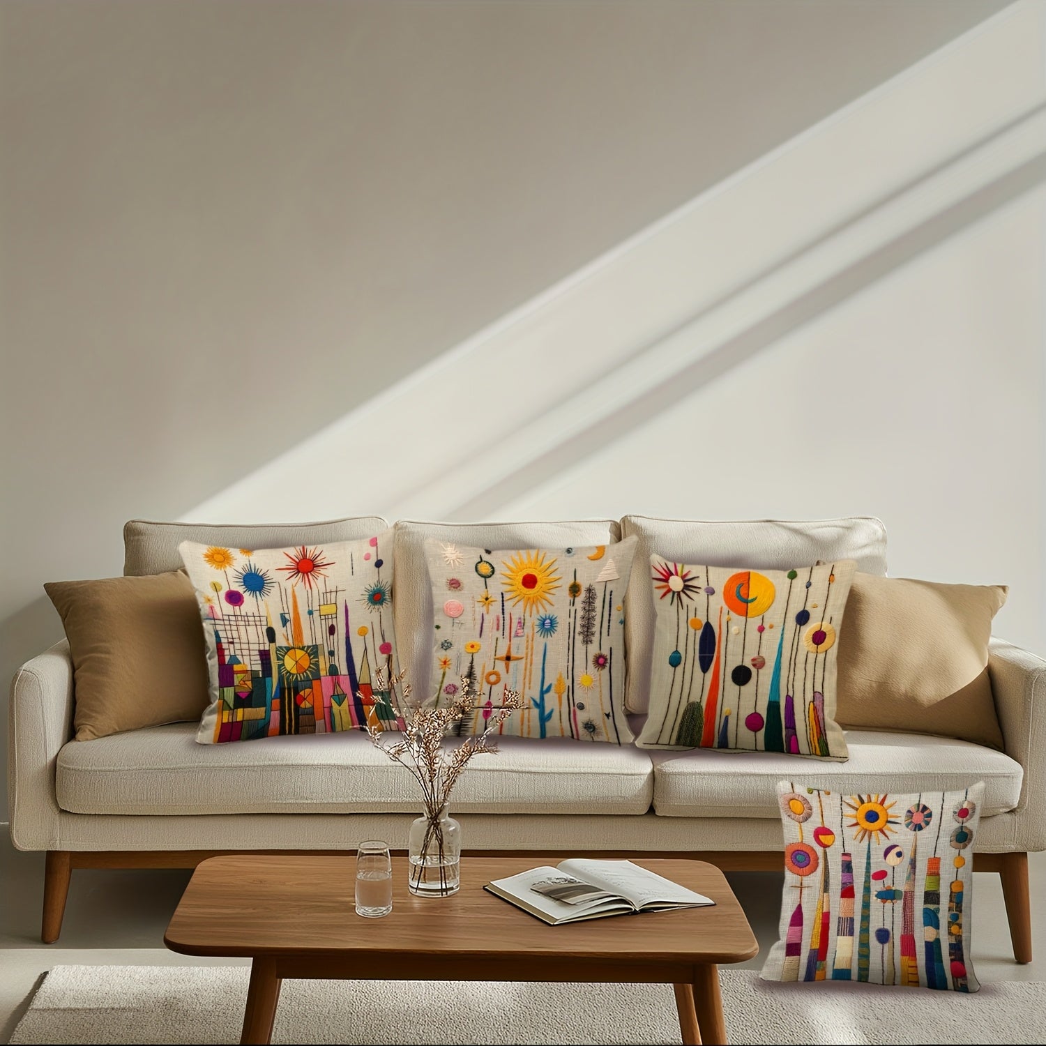 2D printing, 4pcs, abstract pillow set, with beige as the base, featuring elements such as sun and geometric shapes, full of artistic sense, not real embroidery. 45.72*45.72cm, home decoration, suitable for sofas, living rooms