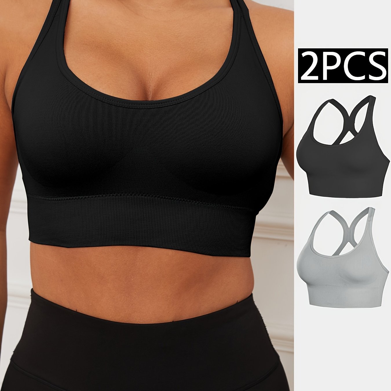 2pcs Stretchy Solid Racer Back Sports Bra, Comfy & Breathable Push Up Fitness Bra, Women's Lingerie & Underwear